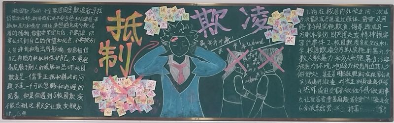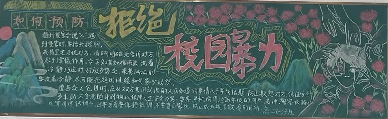 為預(yù)防校園暴力事件,構(gòu)建平安和諧校園,增強(qiáng)學(xué)生法治知識(shí),提高學(xué)生安全防范意識(shí)和自我保護(hù)能力。10月份我校開(kāi)展了以“預(yù)防校園暴力、杜絕欺凌事件”為主題的板報(bào)活動(dòng),引領(lǐng)全體學(xué)生自覺(jué)遵守法律法規(guī)、校規(guī)校紀(jì),理性對(duì)待同學(xué)之間的矛盾糾紛,克制不良行為。10月底,學(xué)生會(huì)秘書(shū)部在校團(tuán)委羅書(shū)記的帶領(lǐng)下對(duì)本次黑板報(bào)進(jìn)行了檢查和評(píng)比,201班、202班、204班黑板報(bào)榮獲優(yōu)秀等級(jí)。