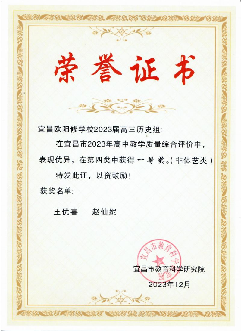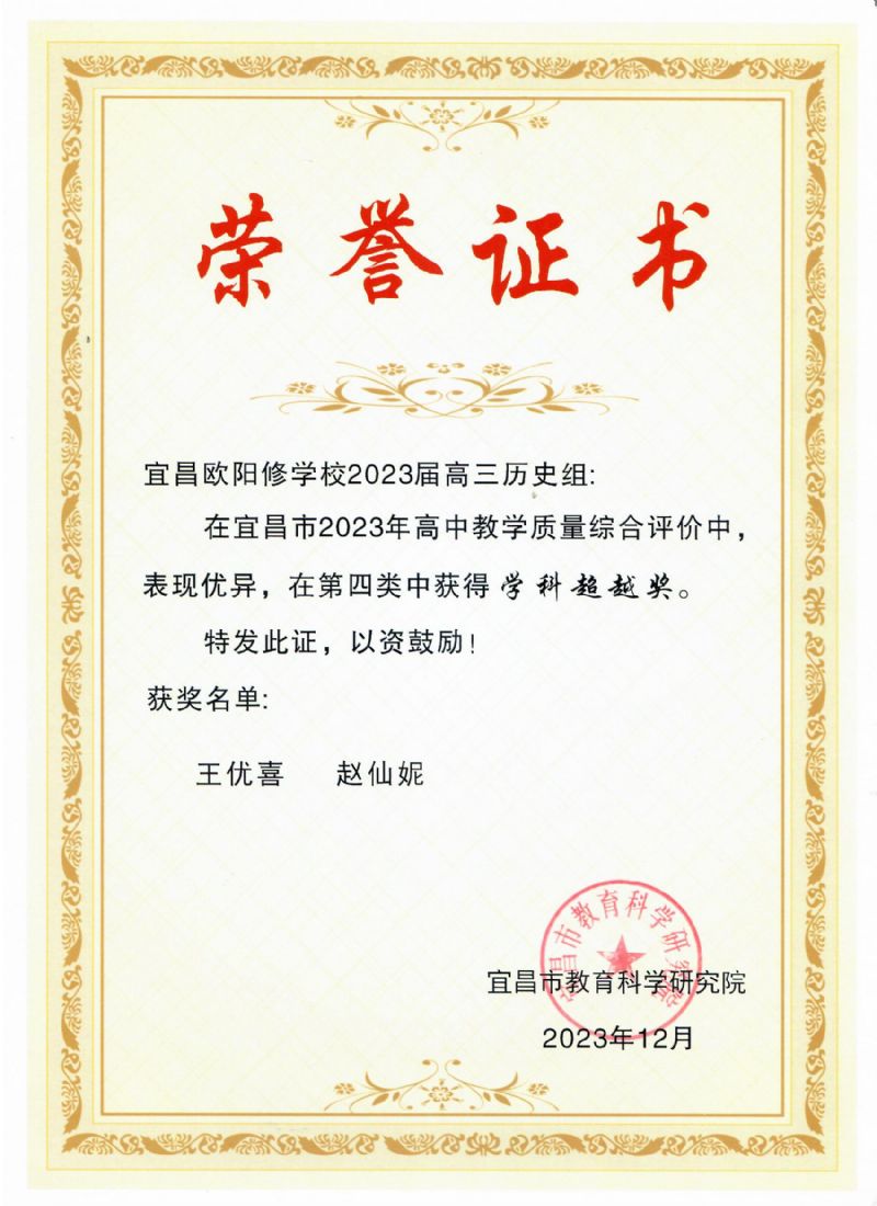在宜昌市2023年高中教學質(zhì)量綜合評價中,我校高三歷史教研組表現(xiàn)優(yōu)異,榮獲同類學校一等獎和學科超越獎。