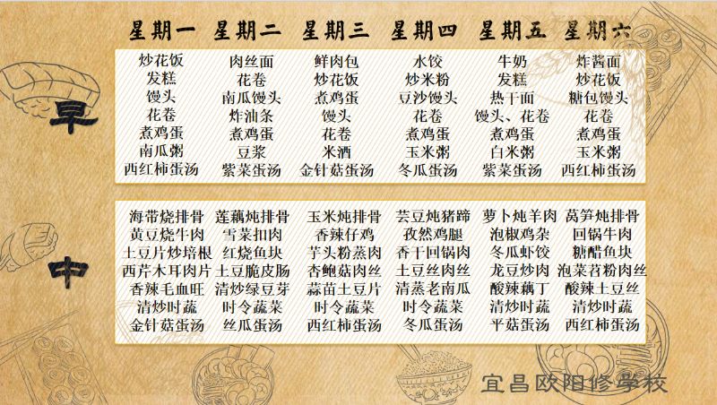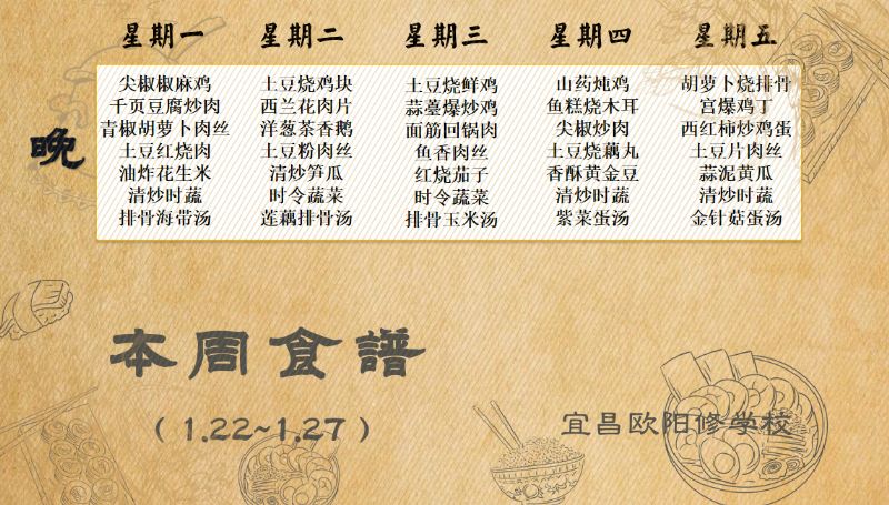 宜昌歐陽修學校每周食譜(1月22日至1月27日)