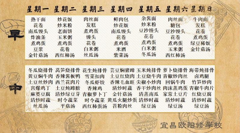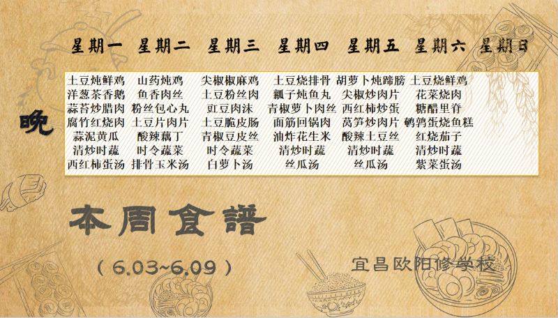 宜昌歐陽修學校每周食譜(6月3日至6月9日)