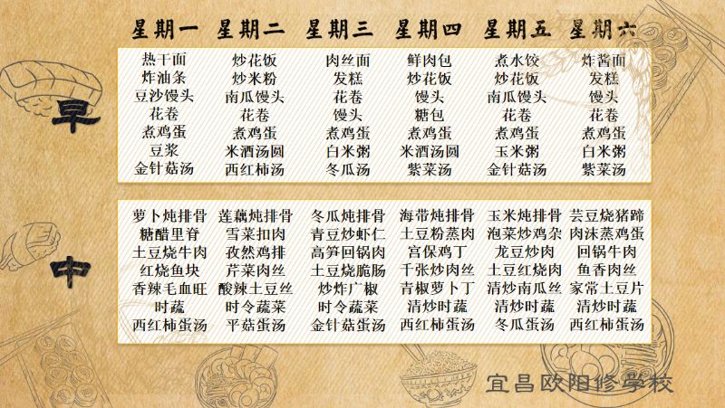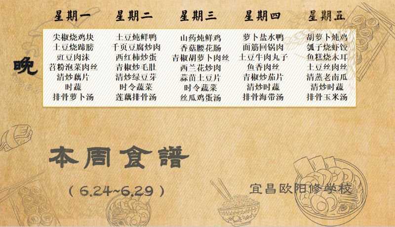宜昌歐陽修學校每周食譜(6月24日至6月29日)