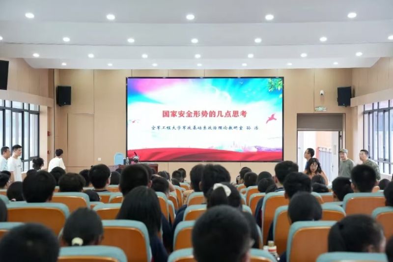 校園國(guó)防教育是全民國(guó)防教育的基礎(chǔ)。為進(jìn)一步弘揚(yáng)愛國(guó)主義精神,加強(qiáng)青少年思想政治建設(shè),深入挖掘愛國(guó)主義精神內(nèi)涵,賡續(xù)紅色血脈,厚植國(guó)防教育情懷和愛黨、愛國(guó)、愛社會(huì)主義情感。26日下午,學(xué)校組織高一新生開展有關(guān)《國(guó)家安全形勢(shì)的幾點(diǎn)思考》專題教育講座。講座上來自空軍工程大學(xué)軍政基礎(chǔ)系政治理論教研室的孫浩教授從當(dāng)前我國(guó)國(guó)家安全面臨的時(shí)代特征、風(fēng)險(xiǎn)挑戰(zhàn)以及防范化解國(guó)家安全風(fēng)險(xiǎn)的內(nèi)外條件三個(gè)方面細(xì)致地介紹了國(guó)家安全形勢(shì)及變化,在同學(xué)們心底種下了一顆愛國(guó)、擁軍、強(qiáng)軍的種子。