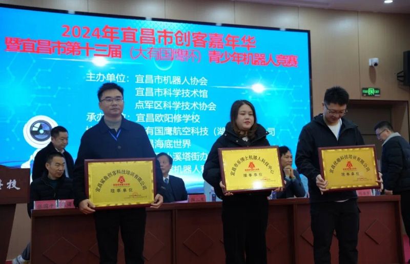 宜昌市科協(xié)副主席張翼、市科協(xié)普及部部長劉亞軍、大有國鷹航空科技(湖北)有限公司總經(jīng)理陳紹文為理事單位——宜昌鯊魚創(chuàng)客科技培訓(xùn)有限公司、宜昌市樂博士機(jī)器人科技中心、宜昌優(yōu)趣科技培訓(xùn)有限公司授牌。
