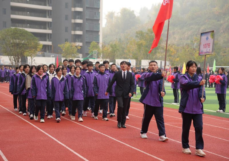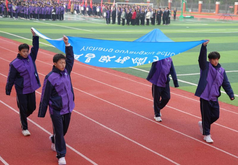 今天上午,運動會開幕式在莊嚴的國歌聲中正式拉開序幕。伴隨著雄壯的運動員進行曲,國旗隊、彩旗隊、花束隊依次走過主席臺,鮮艷的五星紅旗在藍天下迎風飄揚。