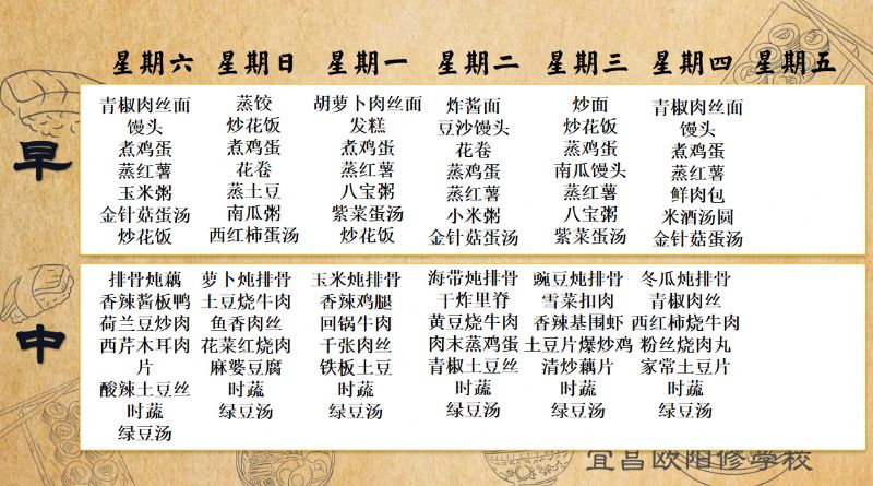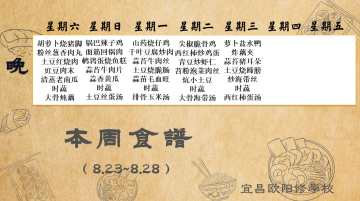 宜昌歐陽修學校每周食譜(8月23日至8月28日)