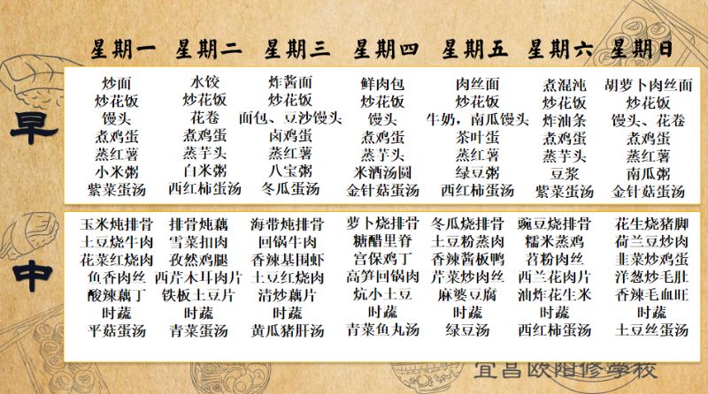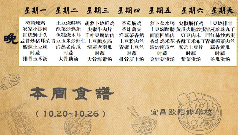 宜昌歐陽修學校每周食譜(10月20日-10月26日)